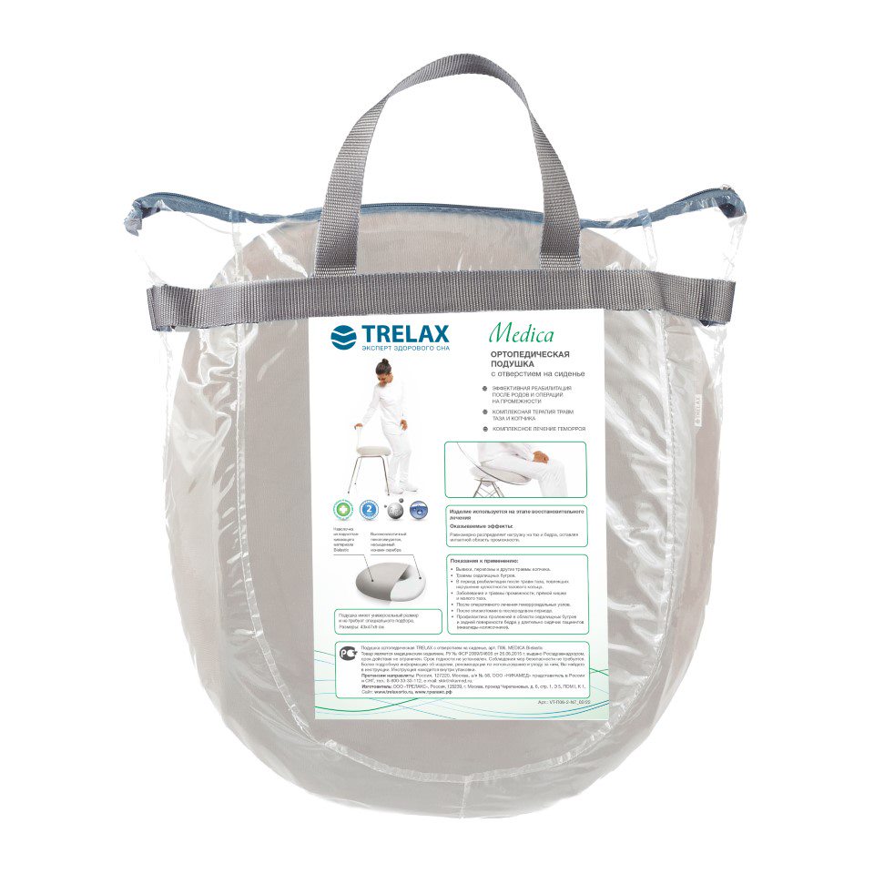 Ортопедическая подушка TRELAX с отверстием (на сиденье) предназначена для разгрузки крестца, копчика и тазового кольца при заболеваниях и травмах промежности, после операций на промежности и органах малого таза, в послеродовом периоде.