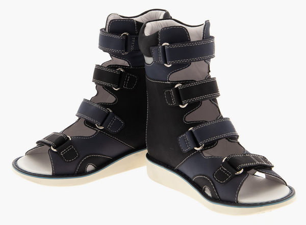 Сандалии изготавливают из нат.кожи. Обеспечивают их жесткой задней частью и берцами, которые отлично поддерживают стопы при их отклонениях. Высокий берец необходим для иммобилизации движения голеностопа. Это дает возможность суставам развиваться правильно или предотвращает развитие деформаций, эффект достигается при регулярном ношении.